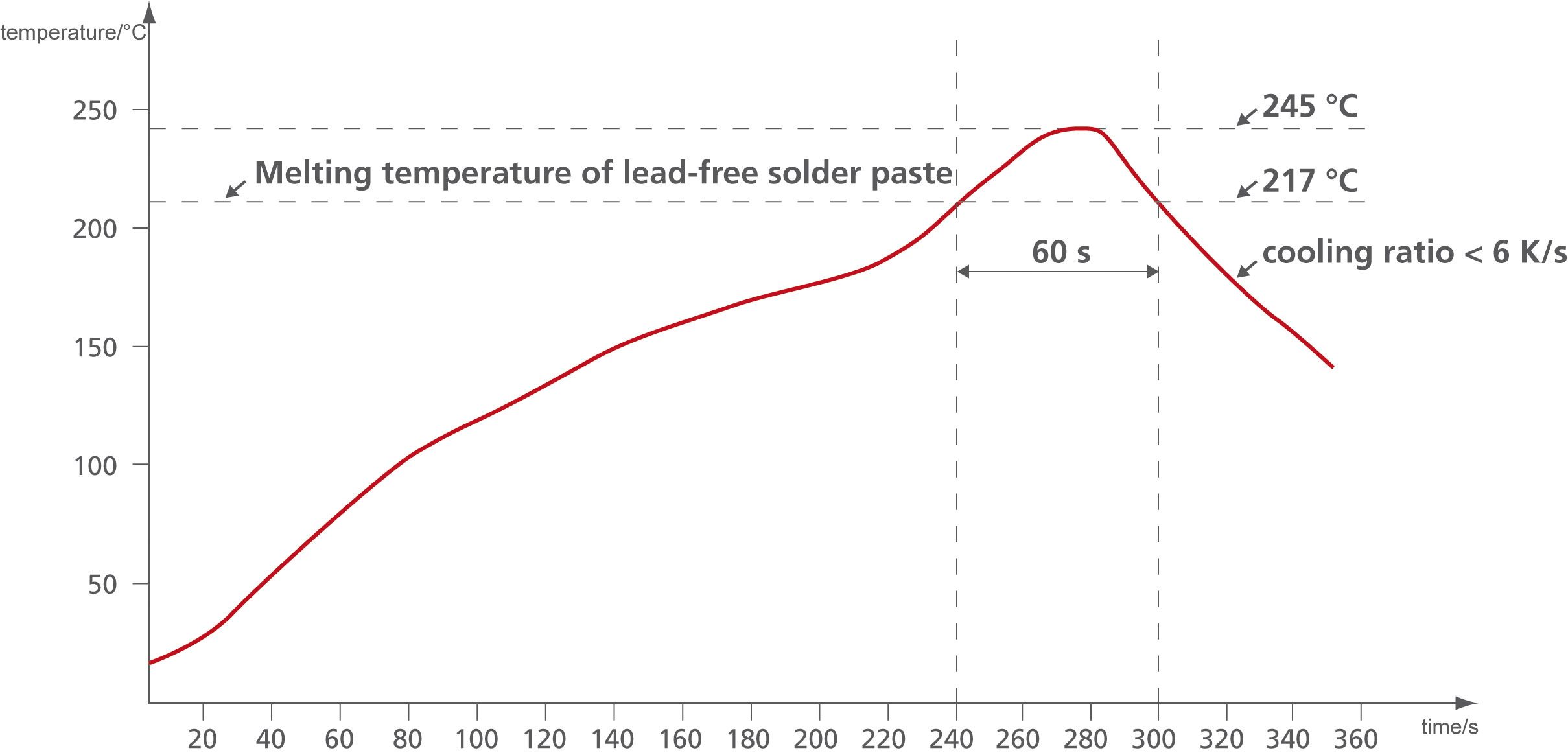 Below we recommend the soldering temperature profiles for reflow soldering process. Please note that these is only recommended profile, because it is not possible to list general parameters for different procedures, circuit boards and components. A soldering profile which produces optimal results must be calculated on an individual basis.